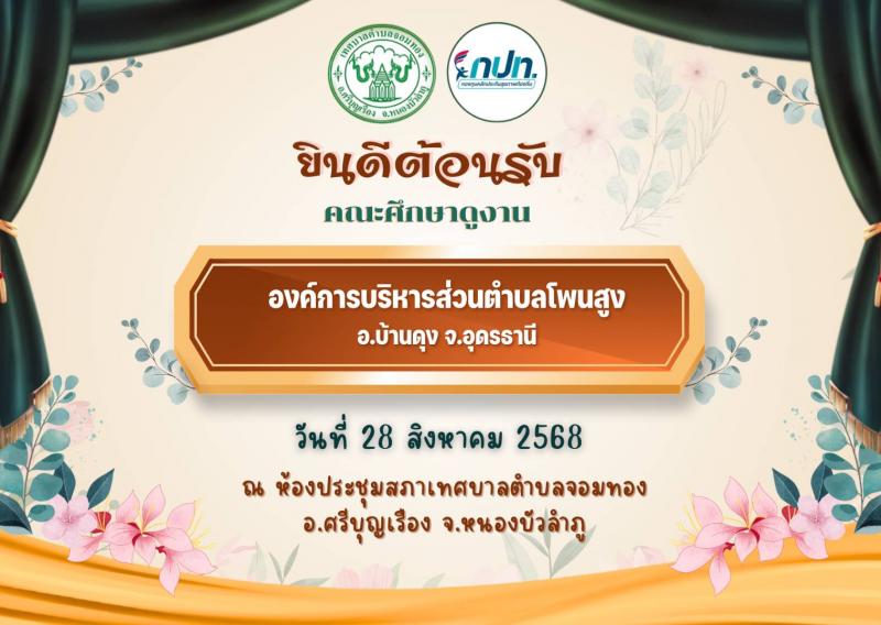 เทศบาลตำบลจอมทอง โดยกองสาธารณสุขและสิ่งแวดล้อม ขอต้อนรับคณะศึกษาดูงานจาก องค์การบริหารส่วนตำบลโพนสูง อ.บ้านดุง จ.อุดรธานี เข้าศึกษาดูงานการบริหารจัดการกองทุนหลักประกันสุขภาพ ตามโครงการพัฒนาศักยภาพบริหารจัดการกองทุนหลักประกันสุขภาพขององค์การบริหารส่วนตำบลโพนสูง อ.บ้านดุง จ.อุดรธานี ในวันที่ 28 สิงหาคม 2568 เวลา 10.30 น. ณ ห้องประชุมสภาเทศบาลตำบลจอมทอง อ.ศรีบุญเรือง จ.หนองบัวลำภู