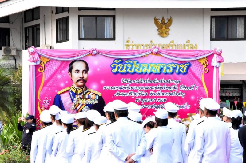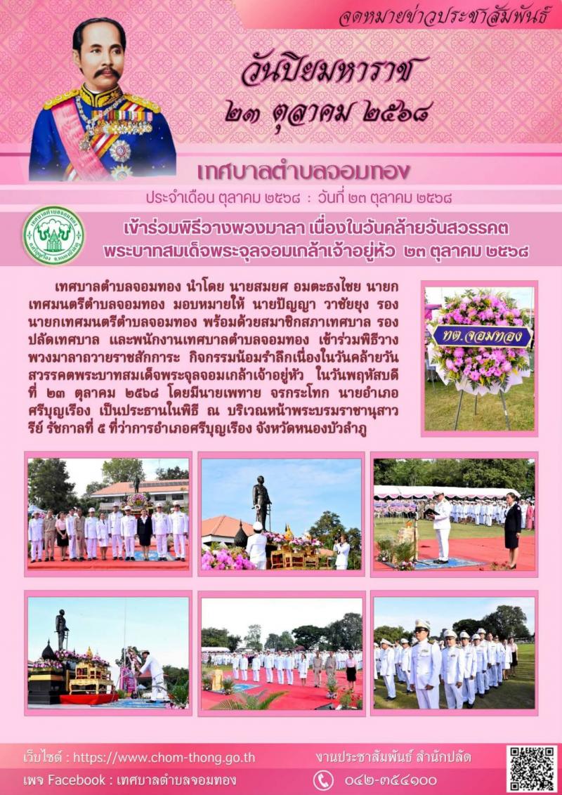 รายละเอียด : วันที่ 23 ตุลาคม 2568 เทศบาลตำบลจอมทอง นำโดยนายสมยศ อมตะธงไชย นายกเทศมนตรีตำบลจอมทอง มอบหมายให้ นายปัญญา วาชัยยุง รองนายกเทศมนตรีฯ พร้อมด้วยสมาชิกสภาเทศบาล รองปลัดเทศบาล แลพนักงานเทศบาลตำบลจอมทอง เข้าร่วมพิธีวางพวงมาลาถวายราชสักกาะ กิจกรรมน้อมรำลึกเนื่องในวันคล้ายวันสวรรคตพระบาทสมเด็จจุลจอมเกล้าเจ้าอยู่หัว ในวันพฤหัสบดีที่ 23 ตุลาคม 2568 โดยมีนายเพทาย จรกระโทก นายอำเภอศรีบุญเรือง เป็นประธานในพิธี ณ บริเวณ หน้าพระบรมราชานุสาวรีย์ รัชกาลที่ 5 ที่ว่าการอำเภอศรีบุญเรือง จังหวัดหนองบัวลำภู